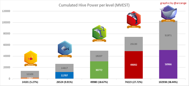This graph shows the distribution of Hive Power cumulated per account level. The left graph shows the distribution without taking into account any delegation made or received by the accounts. The right graphs take into account delegation, adds received HP delegation and subtracts given HP delegation.