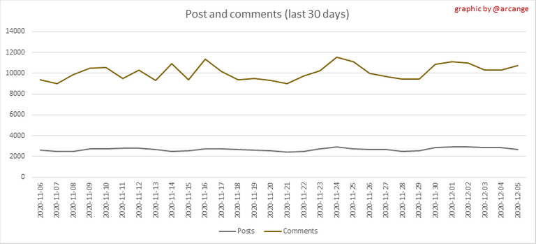 These graphs show the evolution of posts and comments for the whole blockchain lifetime and for the last 30 days.