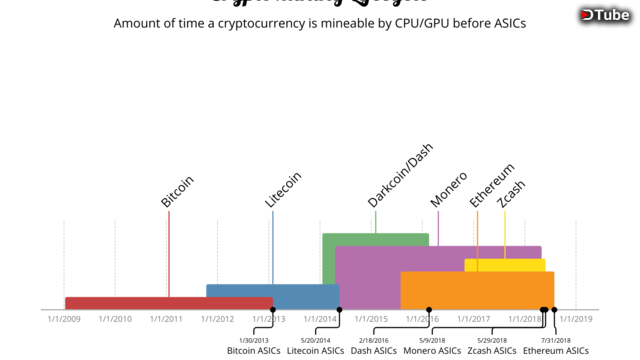 In this presentation, we look at the major cryptocurrencies and how long they were mineable by GPU before the first ASICs. This cycle has repeated itself throughout the beginning of cryptocurrency to today.