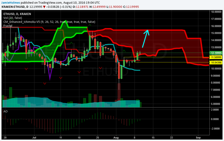 The price of ether currently stands at $12.19995 on the Kraken exchange and the chart below illustrates the long-term outlook. The market managed to close higher than the most recent fractal sell level suggesting bullish momentum will dominate over the coming week. This is indicated on the chart below, where yesterday’s close was $12.23 above the fractal resistance at $11.58999. The next fractals providing resistance lie at $12.69 and $15.23. However, also notice that after a prolonged period of trading outside of the Ichimoku cloud, the market has now moved into the cloud, suggesting the market is finding the equilibrium price for ETH-USD.