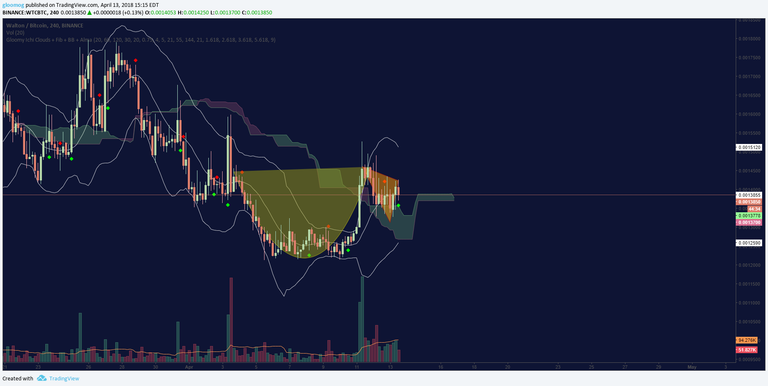 If we open up a chart for WTCBTC on TradingView, specifically looking at the Binance listing. The 4 hour time frame we can see that an Cup and Handle Pattern has formed. That's great and all for those that now what im talking about, but for new comers and curious peepers, we can explain how to trade this. We will be looking at a short term to medium term entry on WTC with an (hopefully!) expected 15%+ profit.