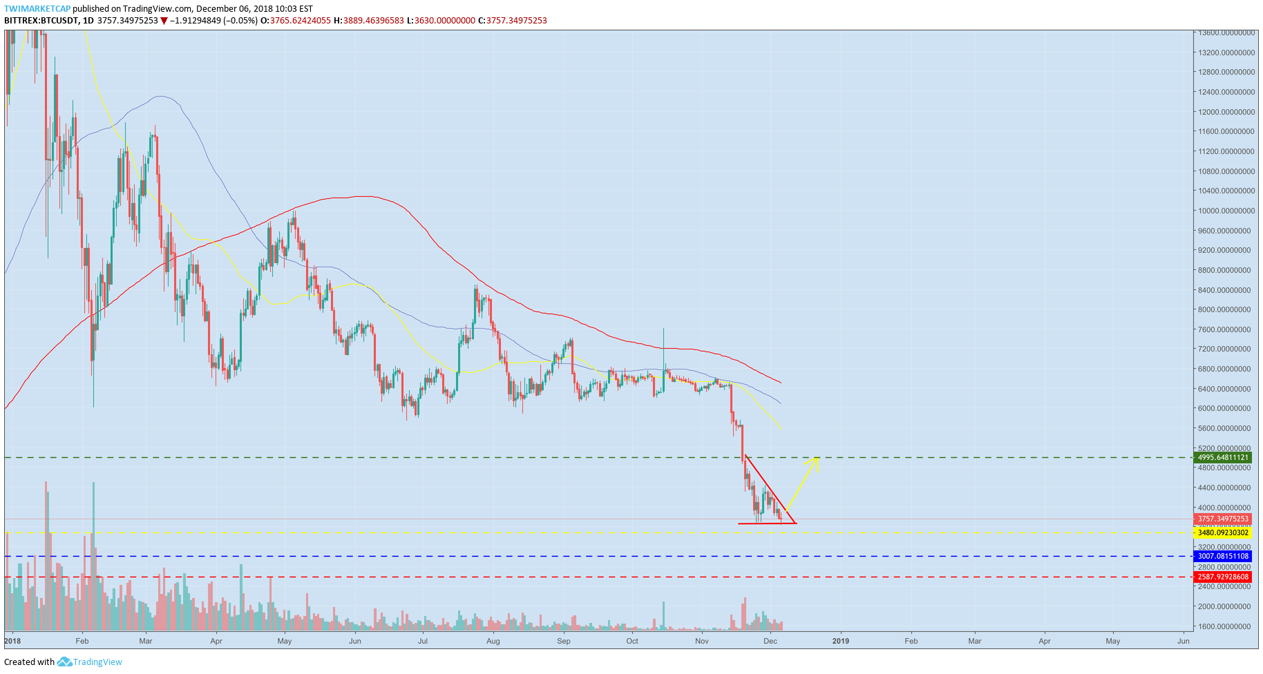Currently Bitcoin BTCUSD is forming a falling wedge , in case BTC breaks out it might send it towards the $5000 area (Green dotted line), before dropping again.