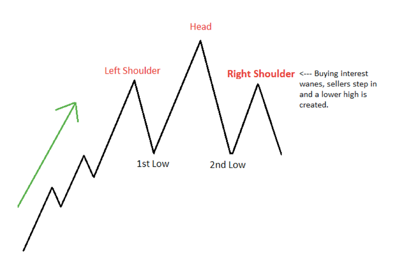After the left shoulder has formed, due to the retracement (first low of the H&S pattern), new buyers enter the market. Bears who shorted during the retracement of the left shoulder buy back in as well, leading to the formation of the head. The new buying power combined with the shorters buying back in leads to a peak, higher than the left shoulder. However, buying power decreases as buyers (bulls) get exhausted, and bears gain the upper hand again. This leads to the second low of the H&S pattern. The second low can be higher, lower or equal to the first low in the H&S pattern.