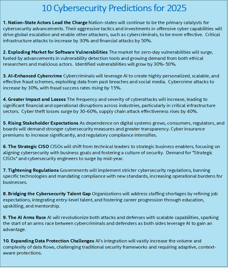 These 10 predictions outline how the cybersecurity landscape in 2025 will present a complex mix of challenges and opportunities. Emerging threats from nation-state actors, AI-driven cyberattacks, and a burgeoning market for software vulnerabilities will redefine how organizations perceive and manage risk. Attackers will benefit from new advantages. Critical infrastructure, financial systems, and supply chains will face elevated threats, compelling businesses to adopt proactive strategies to mitigate risks. As cybercrime grows in sophistication and scale, the need for agile and innovative defenses will become paramount.