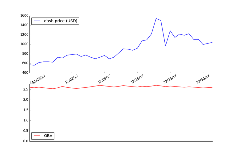 The graph below shows the OBV applied to the price of Dash using daily price data for the last 40 days.