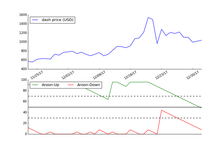 The graph below shows the Aroon Indicator using the price of Dash over the last 40 days.