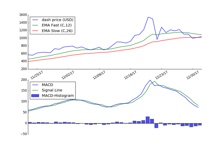 The graph below shows the MACD applied to the price of Dash using daily price data for the last 40 days.