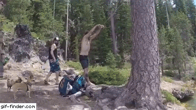Ouch I hope those rocks did not hurt too bad lucky his dog was there to dive in and save him...