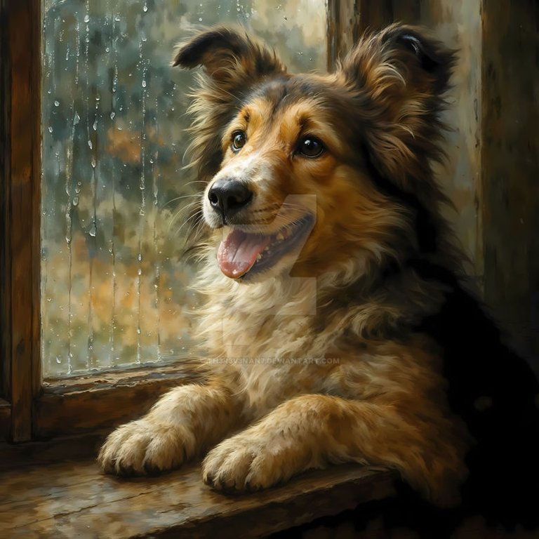 A tenderly nostalgic ultra-realistic digital painting featuring a beautiful Shetland Sheepdog (Sheltie) gazing contentedly out a rain-streaked window on a cozy indoor afternoon. The magnificent collie rests its front paws on the wooden windowsill, its luxurious golden-brown and white coat beautifully illuminated by soft natural light filtering through the rain-covered glass. The dog's intelligent dark eyes and gentle smile radiate patience and warmth as water droplets create rivulets down the window pane. The muted olive and amber tones of the scene create an atmosphere of peaceful domesticity and quiet companionship. This heartwarming portrait captures the timeless bond between dogs and their homes, celebrating those peaceful moments when our faithful friends keep watch over their domain while waiting for their family's return.