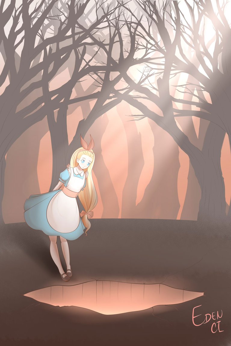 I think people tend to associate somber atmospheres and colors to madness rather than wonder. But I wanted to use these hues and colors to make a contrast between the innocent Alice and the dark woods. At this very moment she is almost in a trance by the sheer wonder of what she could find down the hole. I wanted to make her pop and look almost out of place due to the strong emotion she is feeling at the moment.
