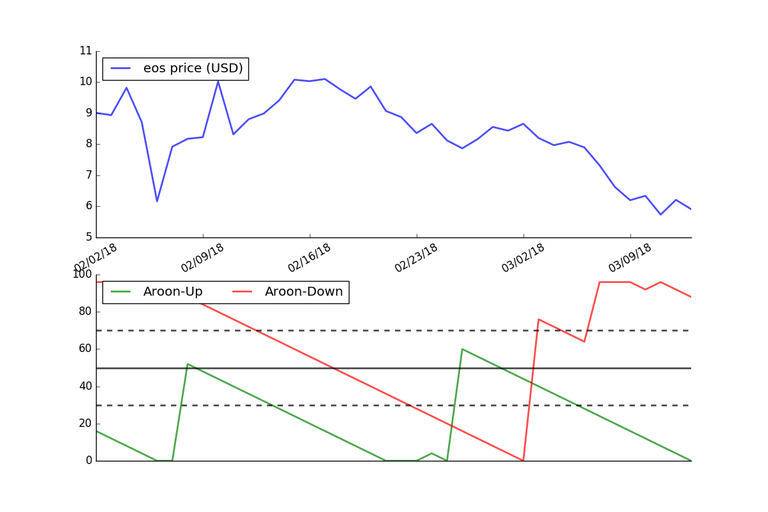 The graph below shows the Aroon Indicator using the price of Eos over the last 40 days.