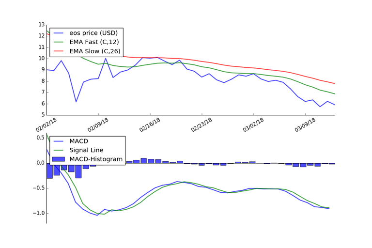 The graph below shows the MACD applied to the price of Eos using daily price data for the last 40 days.