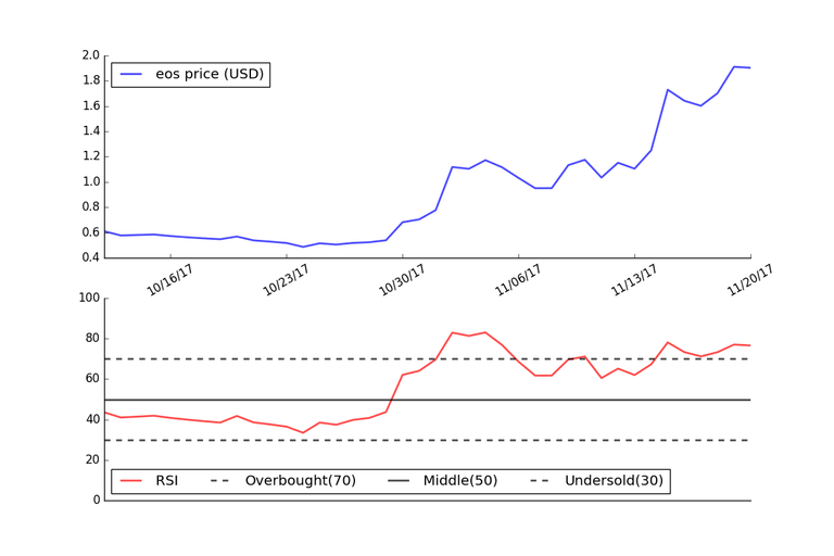 The graph below shows the RSI applied to the price of Steem based on daily price data for the last 40 days.
