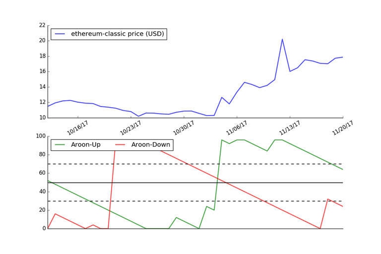 The graph below shows the Aroon Indicator using the price of Ethereum-classic over the last 40 days.