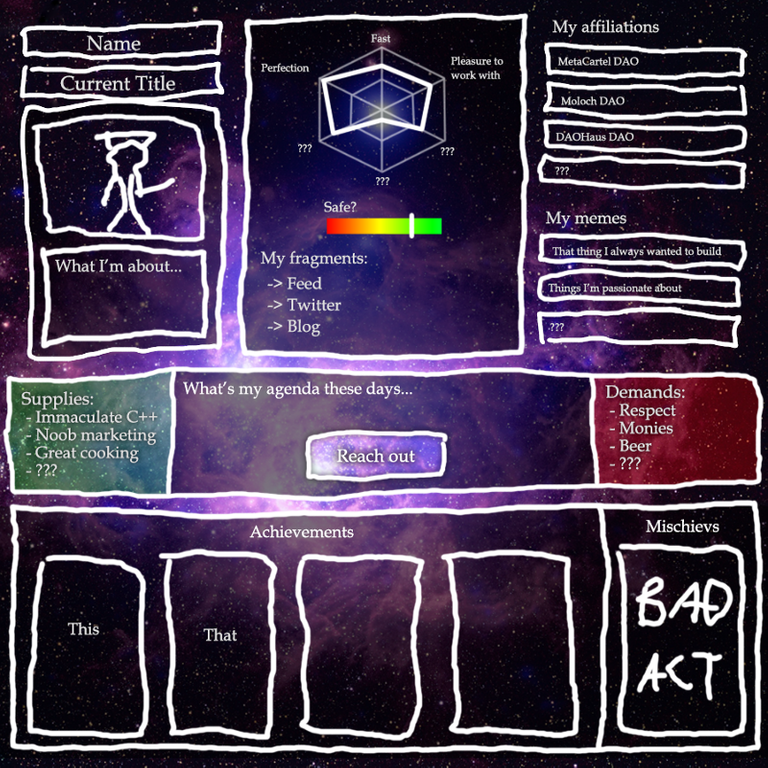 Identities are likely to be based on 3Box, but are meant to serve more as a portfolio/landing page than a social-media profile.Other than skills, titles and achievements, players may also pin: