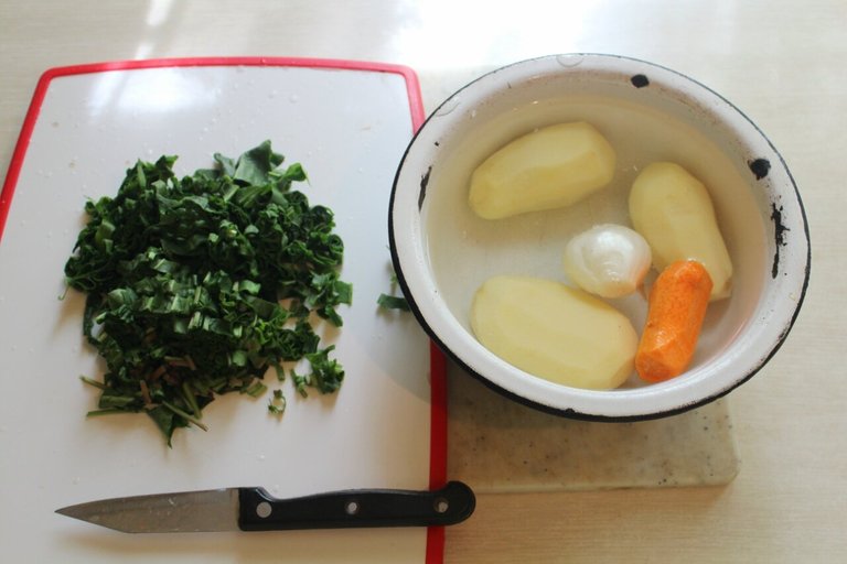 Раз — и мы промываем щавель, который нарвали. Чистим немного картофеля, лука и моркови.