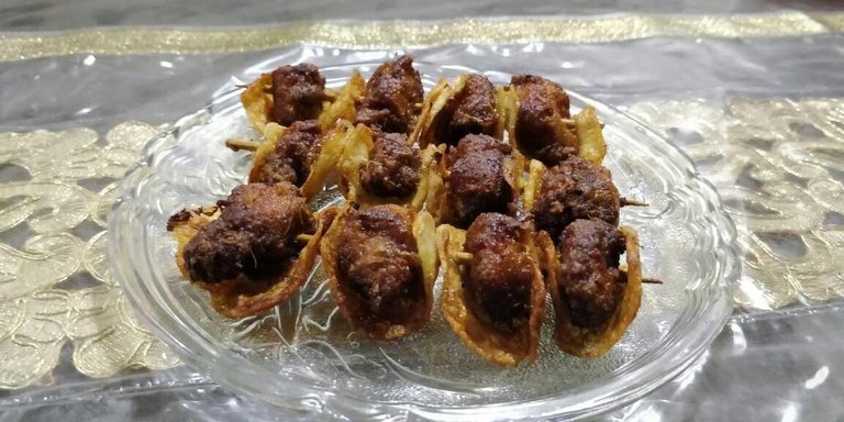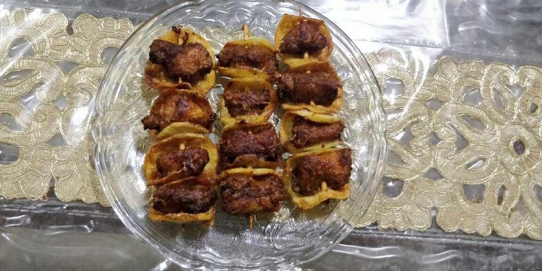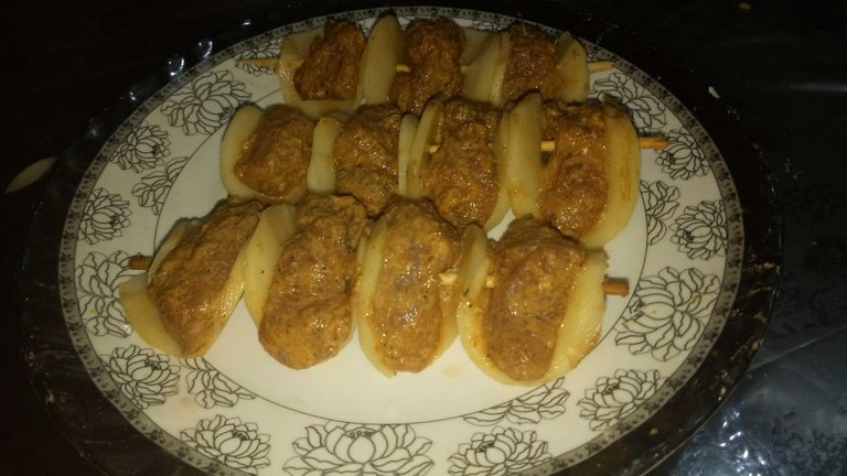 Now take some bamboo skewer (if you dont have skewer you can use tooth pick for single piece) now take a slice of potato and filled chicken cube in it now like this make 3 to 4 skewer as per your want.