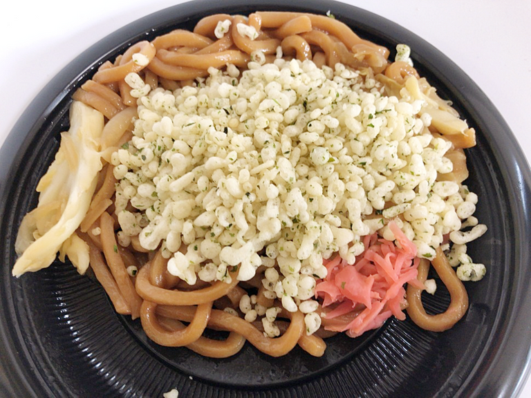 まるでラーメン二郎でヤサイマシマシを頼んだかのような天かすマシマシの焼うどんがお目見え致しました。焼うどんの上に盛られているのはあおさのり入りの天かすです。
