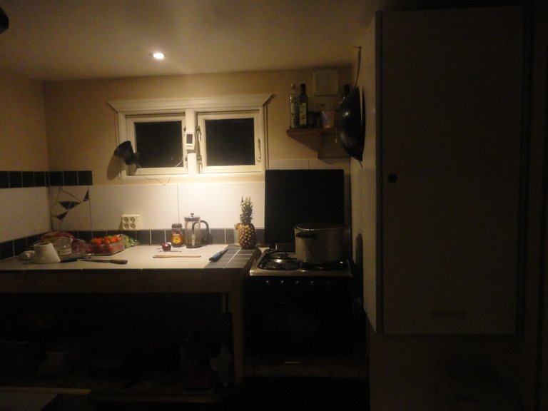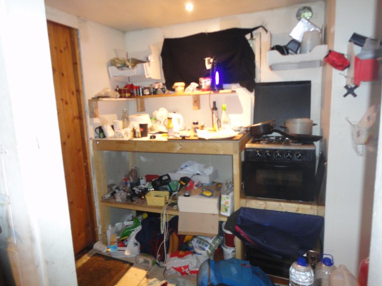 The unit I found is on the right on the work top and will go up on the wall on its side above where it is in the photo below. The surface under the work top will get tiled and also under the gas cooker too and then a nice curtain to cove under the work top area