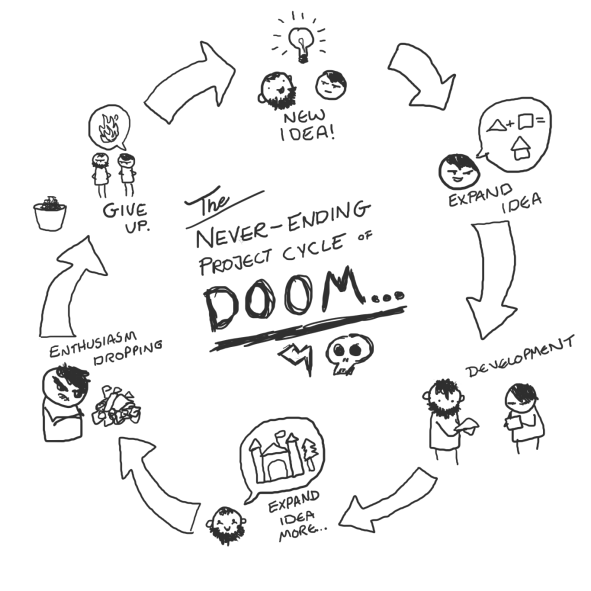 If you are a game developer you are probably familiar with the never ending game development cycle. The cycle starts when you get a great idea : The next big thing! It's a project you are highly motivated to work on and you spend countless hours on it. As the project grows, the development slows and your motivation goes down. While your motivation is extremely low on the project you suddenly get a new idea! The cycle repeats itself in a never ending spiral.