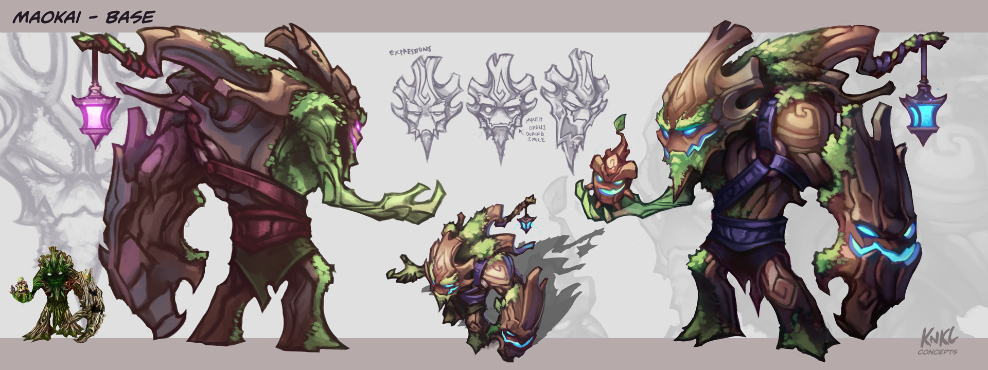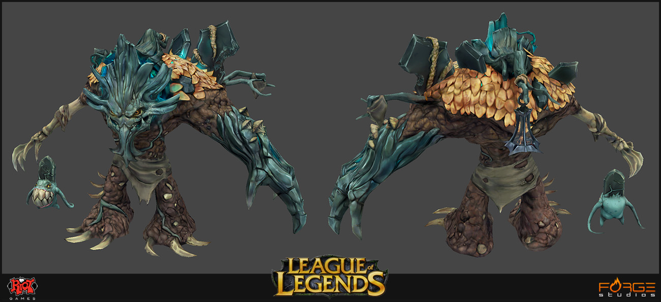 There was a time when Maokai was a peaceful spirit of nature who lived in an idyllic forest, but the arrogance of humans put an end to that life. It is nothing more than a demonic shadow of what one day was, twisted by dark magic that defies the natural order of life and death. Infused with a power he never wanted, the powerful treant became a force of nature that claims vengeance, destroying his enemies using wild magic and hard limbs like steel. He goes to Valoran, in order to return his former glory to the Islands of the Shadow.