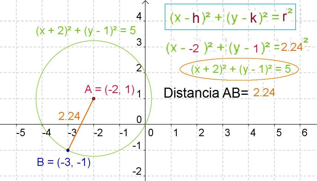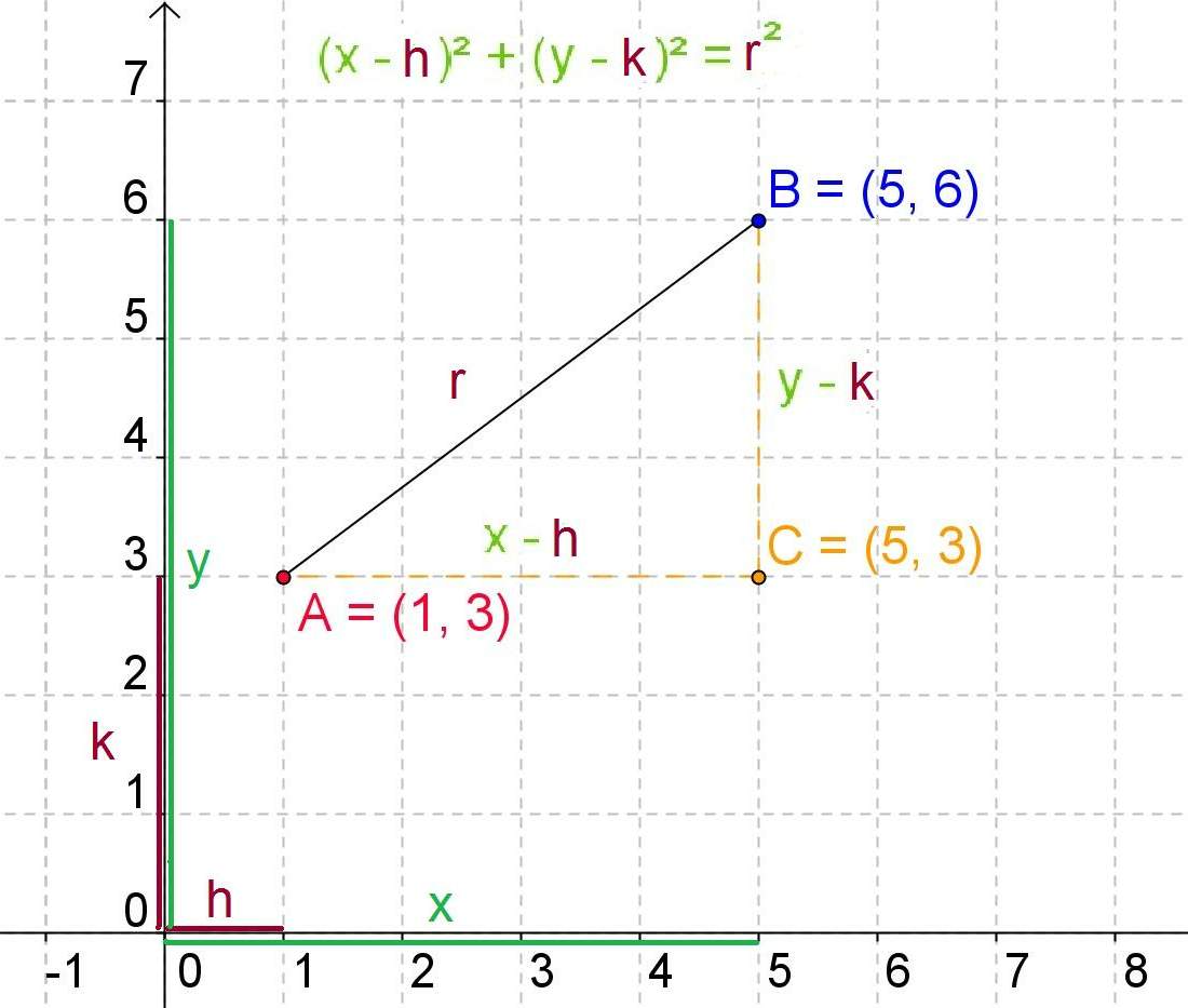 To deduce the equation of the circumference we must take into consideration the concept of distance in analytical geometry. If we want to calculate the distance between two points AB to determine the radius of a circle, we have to think about its lengths or projections on both coordinate axes. The length on the horizontal axis is determined by the coordinates in x, in this case 5 - 1 equal to four, (x-h).