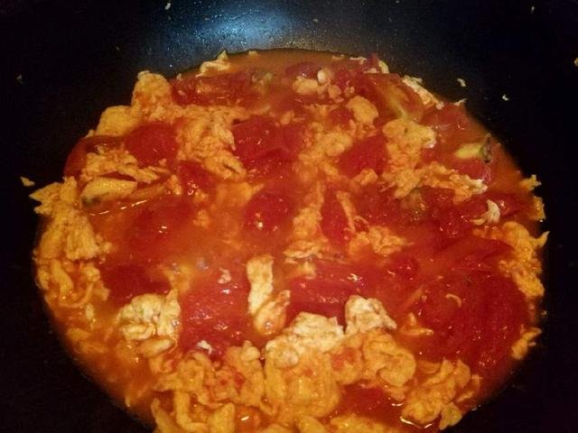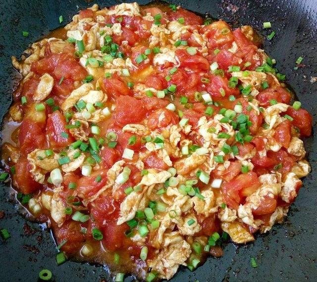 Đổ một ít dầu vào chảo, thêm cà chua, xào cho đến khi mềm, thêm một chút đường, xào một lúc, xào nước ép, đổ trứng mới chiên, khuấy nhanh trên lửa, sau đó thêm lượng muối thích hợp. Thêm hành lá xắt nhỏ và xào một vài lần để phục vụ.