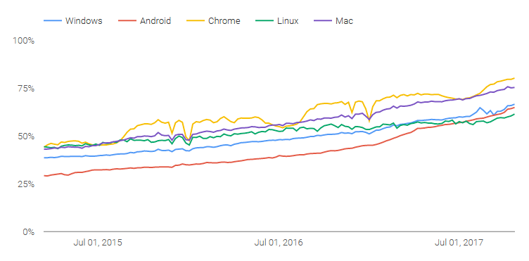 The ultra-modern stats regarding the new protocol HTTPS:// were up to date today. in line with Googles numbers eighty% of Google Chrome visitors is Chrome OS over HTTPS:/// 75% of all Chrome site visitors on MacOS is over sixty seven%, and on Android and Linux combined is set 61%.