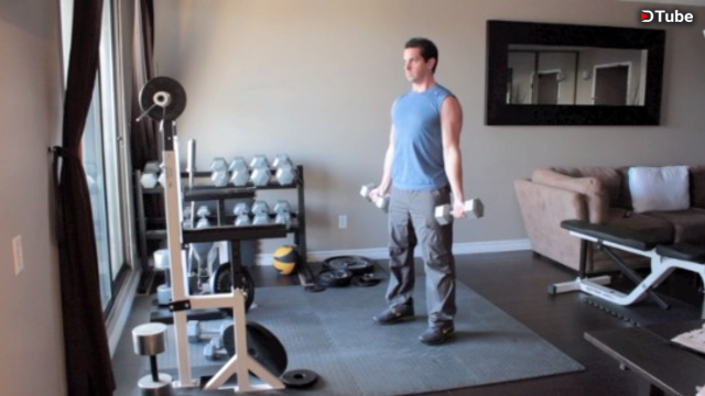 Stand up straight with a dumbbell in each hand at arm's length. Keep your elbows close to your torso and rotate the palms of your hands until they are facing forward. ... Now, keeping the upper arms stationary, exhale and curl the weights while contracting your biceps.