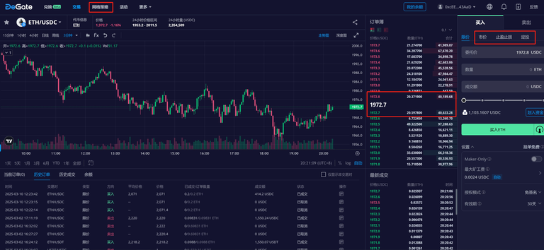主流币交易采用订单簿DEX,具有CEX的交易体验。支持限价交易、定投。(ETH支持止损止盈)。可以查看账户余额、交易历史记录等。