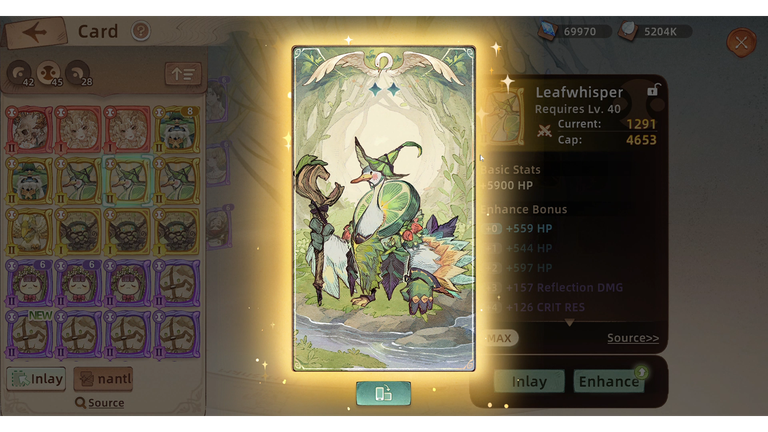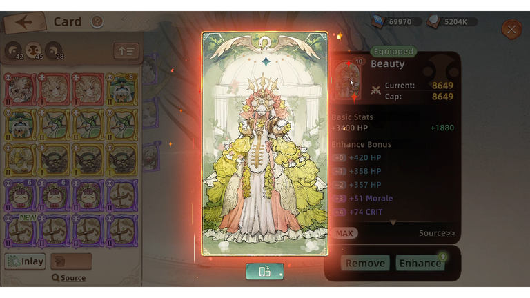 Me encanta el arte del apartado de cartas. Esos dibujos son preciosos. Ya he conseguido un par de cartas rojas (la más raras del juego), pero cuesta mucho subirlas de nivel. Así que tengo que ser paciente, reunir un montón de cristales de maná y esperar el momento adecuado para subir mis cartas de nivel.