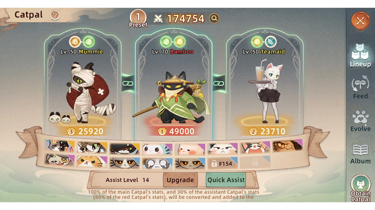 Los amigos gatos (catpals) son mi otra característica favorita. Como sanador, tu daño es bajo en ciertos aspectos del juego, así que lo compensas con amigos gato fuertes y fantasmas que te ayudan a infligir más daño. Hasta ahora, he conseguido uno extremadamente raro (aura roja) y muchos dorados, con algunas copias de cada uno. También quiero conseguir a Sakurako, pero ya veremos cuando alcance el nivel de compasión en el estandarte de los amigos gatos.