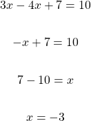 Solve for x in the equation 3x - 4x + 7 = 10.