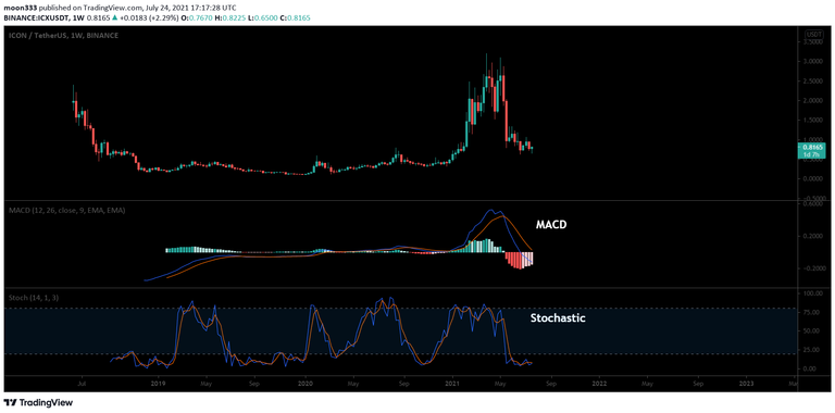 On the weekly time frame, it can be seen that while the price action has found very strong support at $0.60, at the same time the stochastic has also entered the oversold zone and MACD is giving bullish signals by changing from a strong bearish to weak bearish.