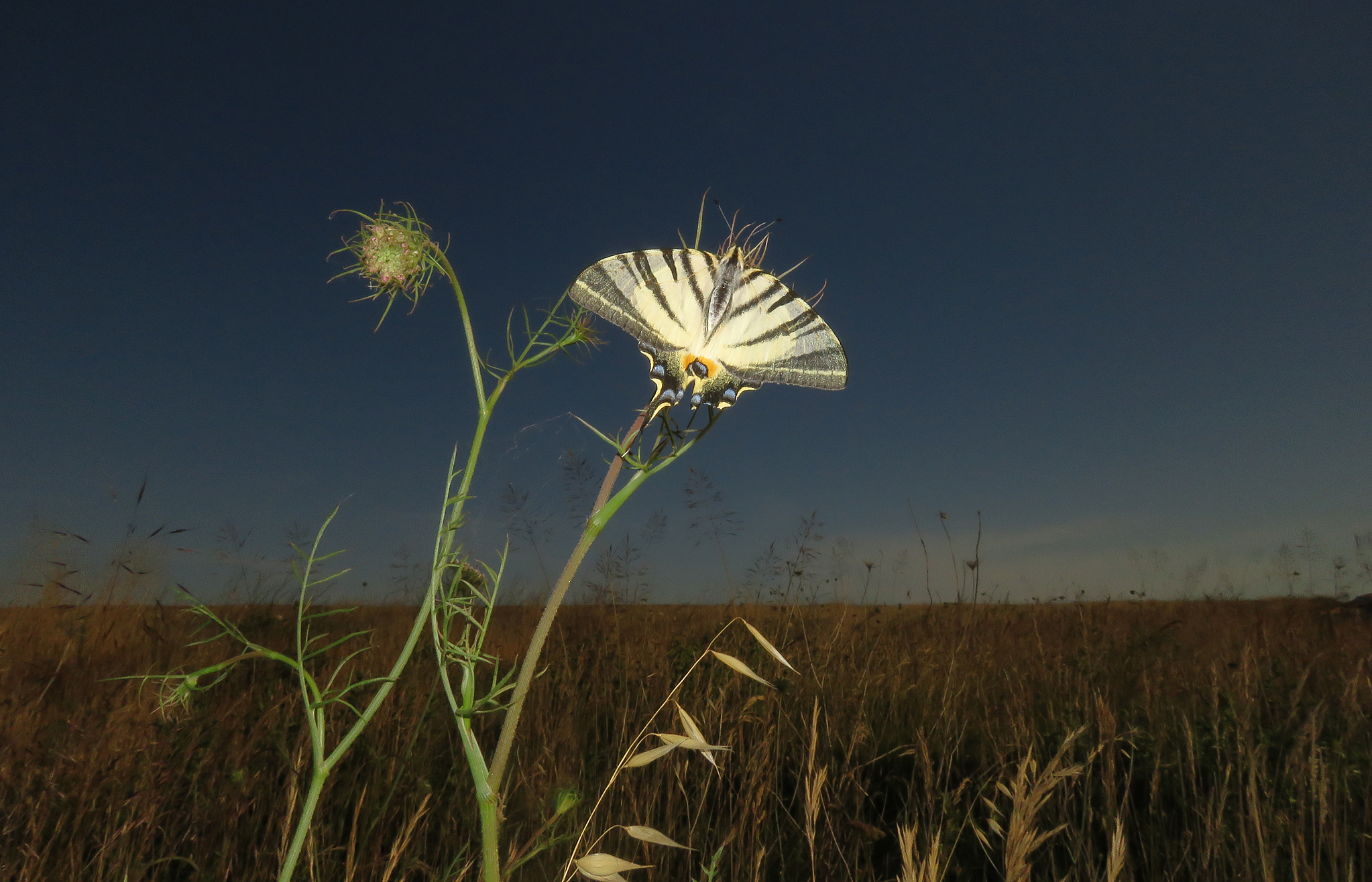 I took this shot on the sunny afternoon ... using the flash to create a weird, crepuscular atmosphere. This is the Scarce Swallowtail (Iphiclides podalirius) resting on the Wild carrot flower ... and this is also the intro for the evening chapter of this post.