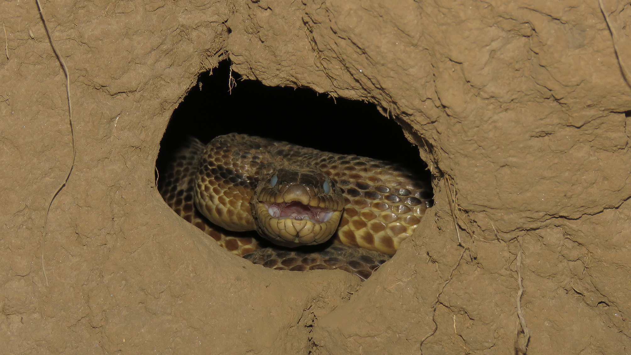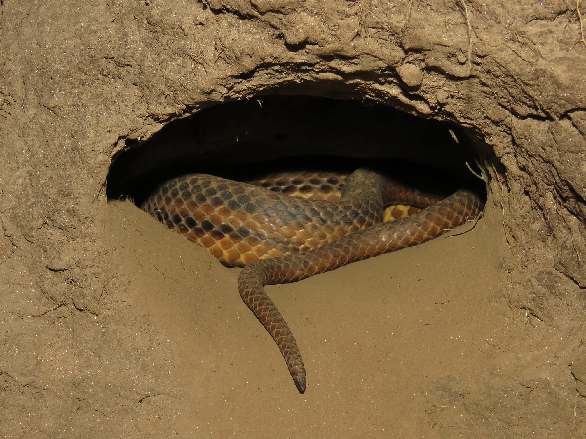 :) Is the only species here that is so big ... all the other snakes are kind of normal ... but there are two venomous species too ... and only one colorful species with red patterns ... the snakes here are mostly brown, gray, earthy colors.