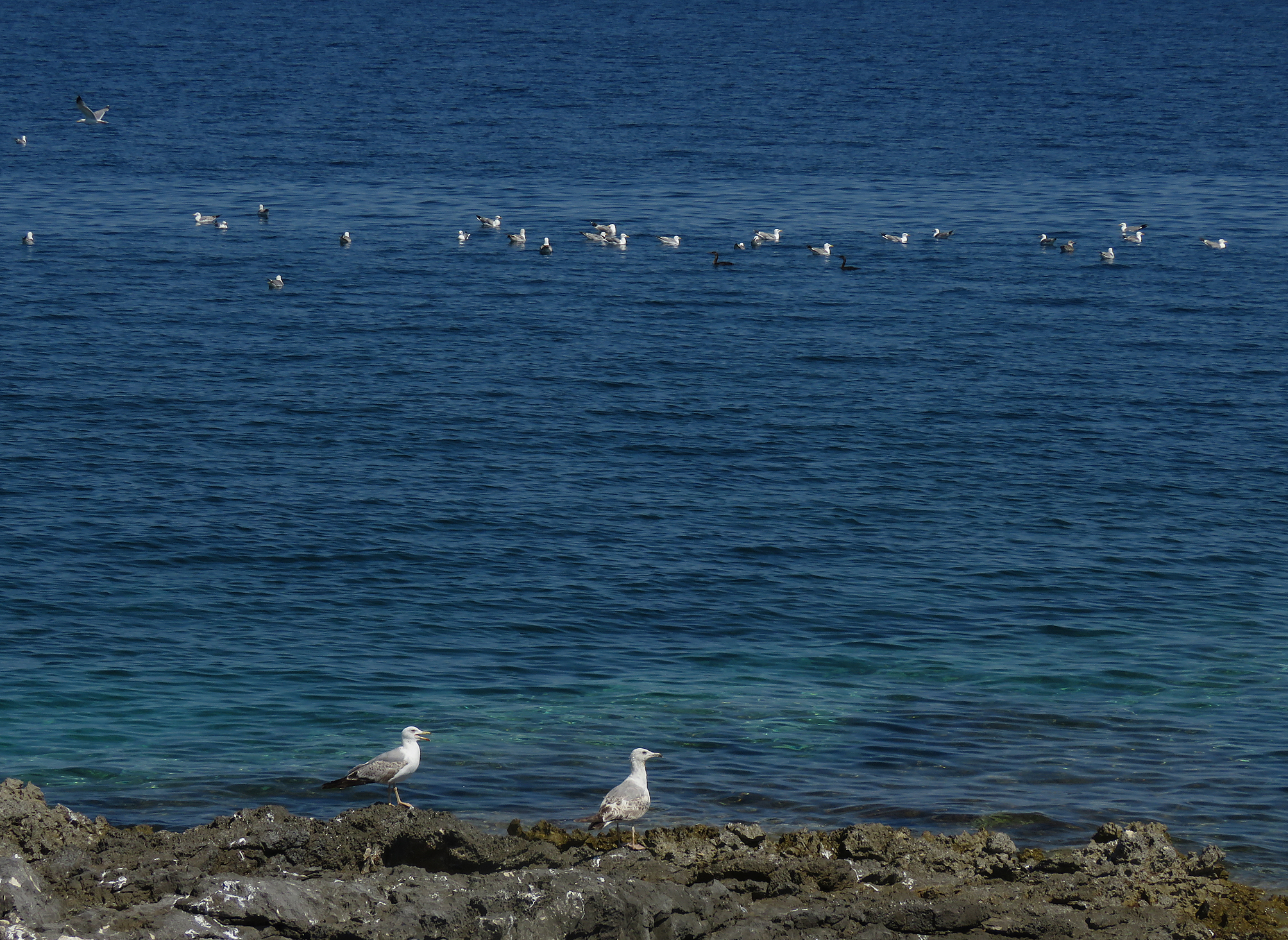Very beautiful blue sea and blue sky with those noisy seagulls! The first photo is very eye catching! The second one us very funny looking like a big bird’s dropping floating around!