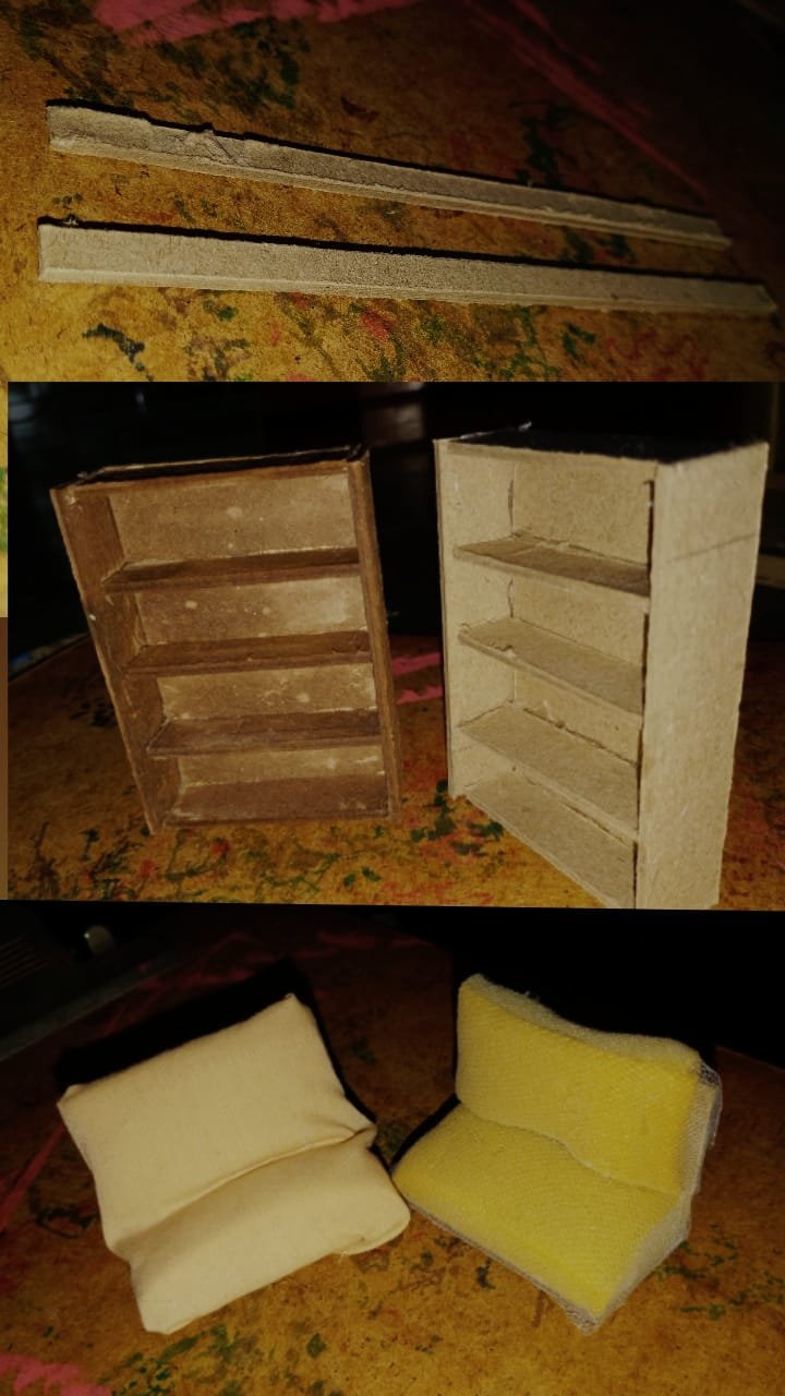 Los muebles los forré con una malla para darle forma a la espuma que coloqué y que pareciera más un mueble. Todas las partes están hechas con cartón de 5 milímetros, lo cual dificultaba un poco cortar el material.