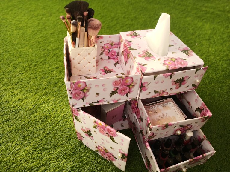Now there was some space left on top so I made a tissue box on top of it to make it I cut cardboard in the shape of a tissue box then covered it with a sheet then stuck it on the organizer then I put tissues in it and when I saw it was working very well.