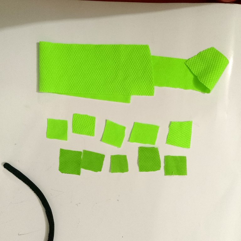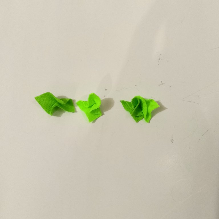 With the piece of green fabric, cut out squares of approximately 2x2 cm, put a drop of silicone in the center and with my fingers I squeezed it, so that it looks as shown in the image.