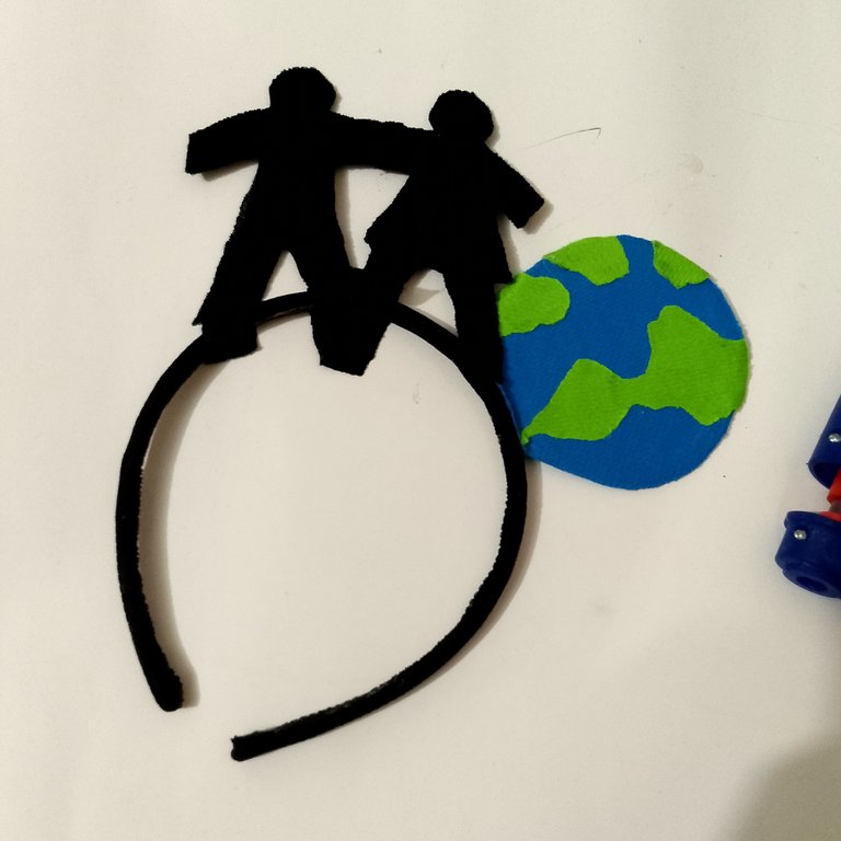 Y realizo el mismo procedimiento con la silueta de los niños, lo pego al cintillo justo por la parte de tela sobrante y pego la silueta un poco a la tierra para que quede más fija.