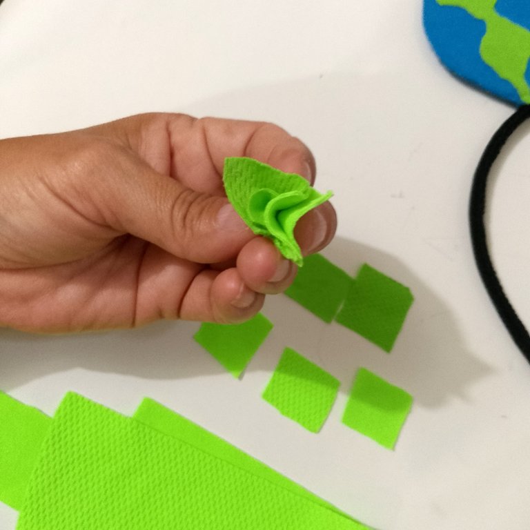 Con el retazo de tela verde, recorte cuadros de 2x2 cm aproximadamente, le eche una gota de silicón en el centro y con los dedos la apreté, para que quede de la forma como se muestra en la imagen.