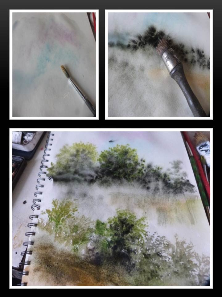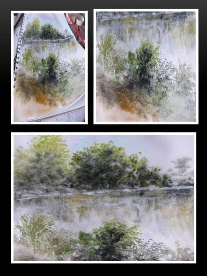 Desde la tenue mancha color pastel de azul y rosado, logrado con la técnica de la aguada, en donde con el soporte húmedo se irán involucrando manchas en negro, verdes oscuros y claros que hagan contraste en la realización de los arbustos que forman parte de la naturaleza, como lo muestran los avances del trabajo pictórico, en el cual se observa como el paisaje toma forma perspectiva y profundidad marcada por los diferentes planos de la vegetación presente, el agua de la laguna en el centro y el cielo tenue en el firmamento.