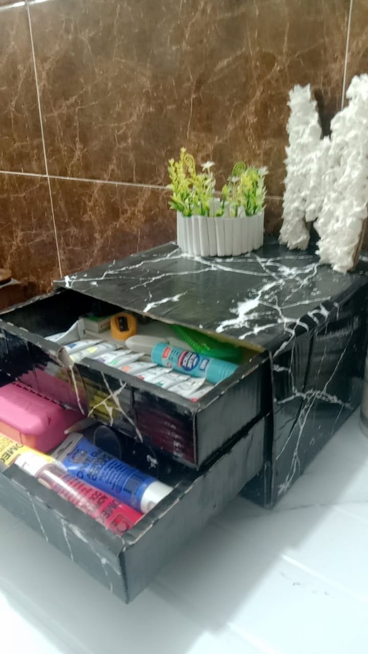My art tablet is beautiful, and my art table is filled with all sorts of things brushes, drawing tools, and more. I've also made boxes for my pens and arranged them on the wall. I've created a drinking corner and made flower arrangements.