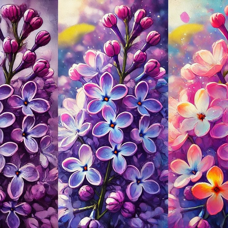 To create these unique images, I started with a base photograph of beautiful lilac flowers. The original photo served as a visual foundation, capturing the delicate shapes, natural colors, and lighting of the real blossoms.
