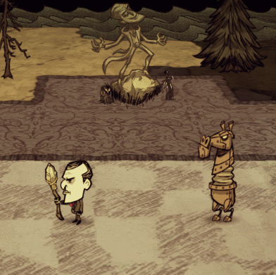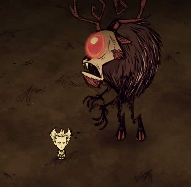 It looked so cute I almost didn't hunt it. ALMOST. Looking back that would probably be the smart move, because it absolutely trashed me. Sooooo yeah that was my second death. There were probably a ton of ways I could have not starved in that situation, and unfortunately I hadn't learnt the combat of this game yet. It is possible to not take damage when fighting, but you have to learn the attack patterns of the monsters. Here's a little GIF from the Don't Starve wiki: