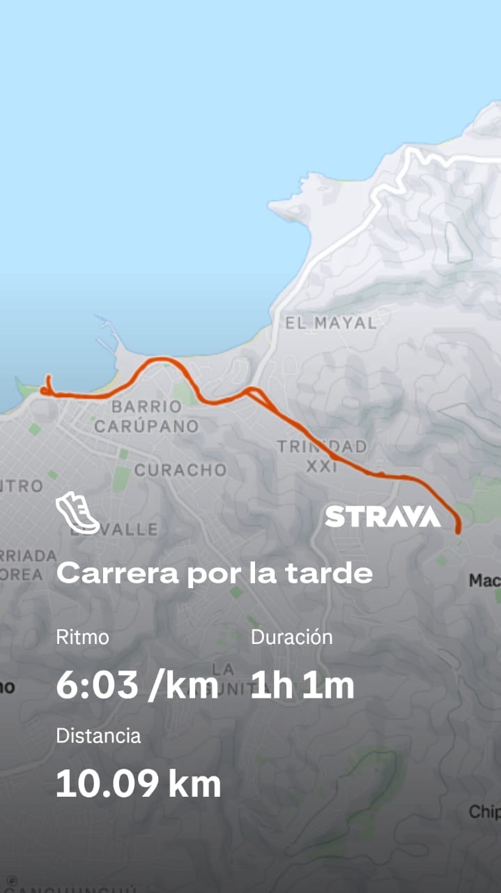 Salimos a correr por la línea costera, un lugar que me llena de felicidad y tranquilidad. Mi plan para el día era simple: entrenar por tiempo y sensaciones durante una hora, enfocándome en construir poco a poco una base sólida para el maratón en el que estoy decidido a participar. La idea era disfrutar del momento y, aunque había pasado un tiempo desde mi última carrera, sentía que era el momento perfecto para regresar.