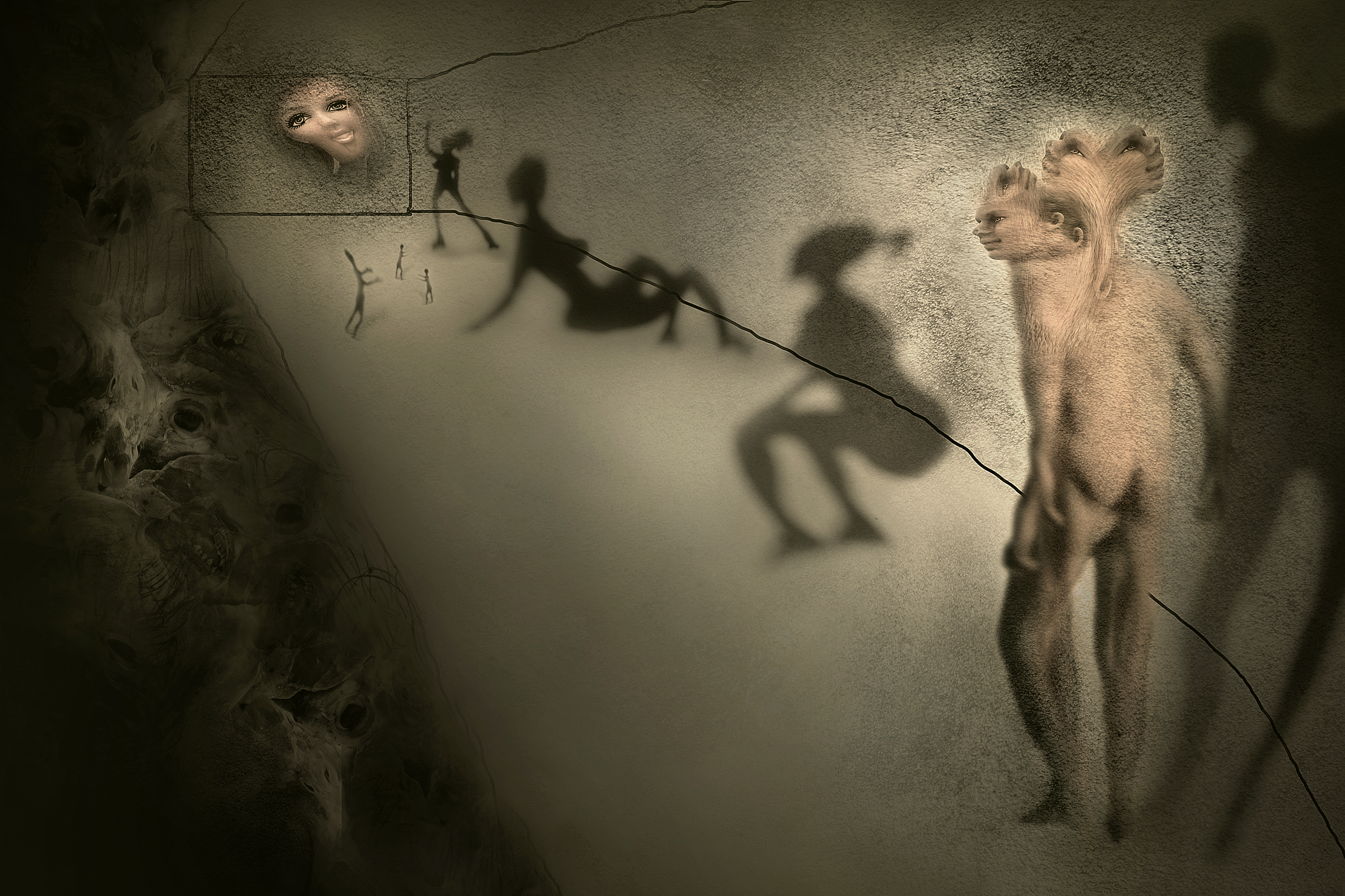 I made this collage ... illustration ... or whatever this thing is ... some years ago ... more than 7 surely. I found it among the old photographs and stuff. I remember photographing some Barbie dolls and then drawing some simple human figures that I will latter cut out and photograph their shadows ... and then mix those things in photoshop, while adding some fast and raw sketch drawings, some textures from other photographs I took and a few lines in the simple paint program for Windows.