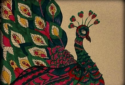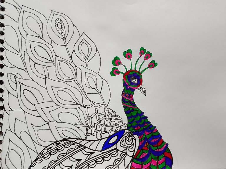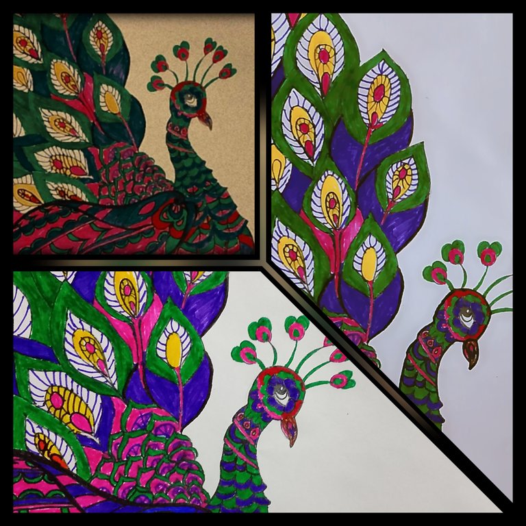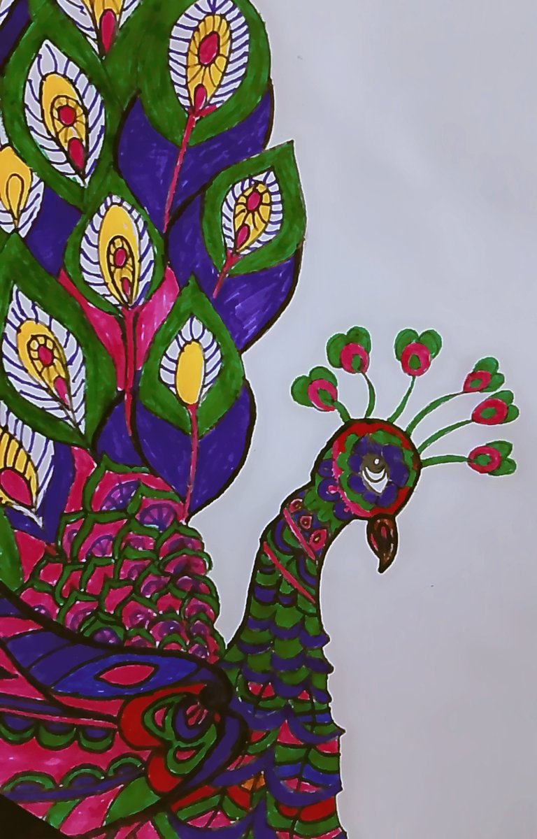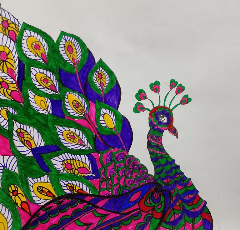 Finally,in the last i have just made some patterns in the feathers of the peacock and then i have used yellow,pink,green, purple,blue and somewhere red color.Moreover,i have filled the brown and purple color in the beak of the peacock.