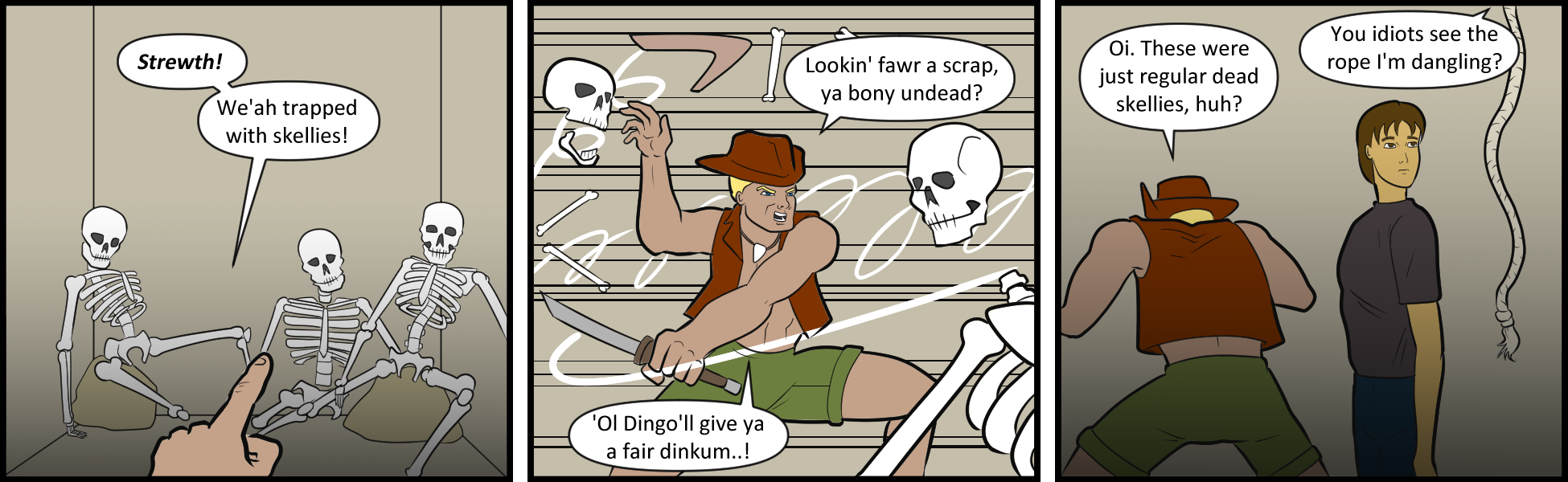 At least he gave those dusty old bones what-for! Showed them who's boss. And he didn't lose a fight to inanimate objects! That's a victory in anyone's books.